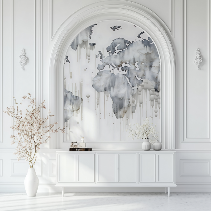 Transform your space with our World Map Painting Wallpaper . This elegant and artistic design features a world map in shades of gray and blue, bringing a touch of sophistication to your home. Perfect for living rooms, offices , or even adult bedrooms , this wallpaper will create a captivating focal point in any room.