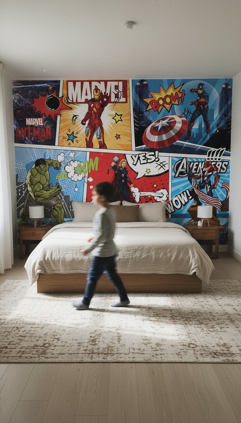 Se il tuo bambino è un fan degli Avengers, scegli questa graziosa carta da parati per decorare la sua cameretta. Questa sublime carta da parati creerà un universo unico sul tema dei fumetti Marvel con i supereroi più famosi e porterà una decorazione originale nella stanza del tuo bambino.