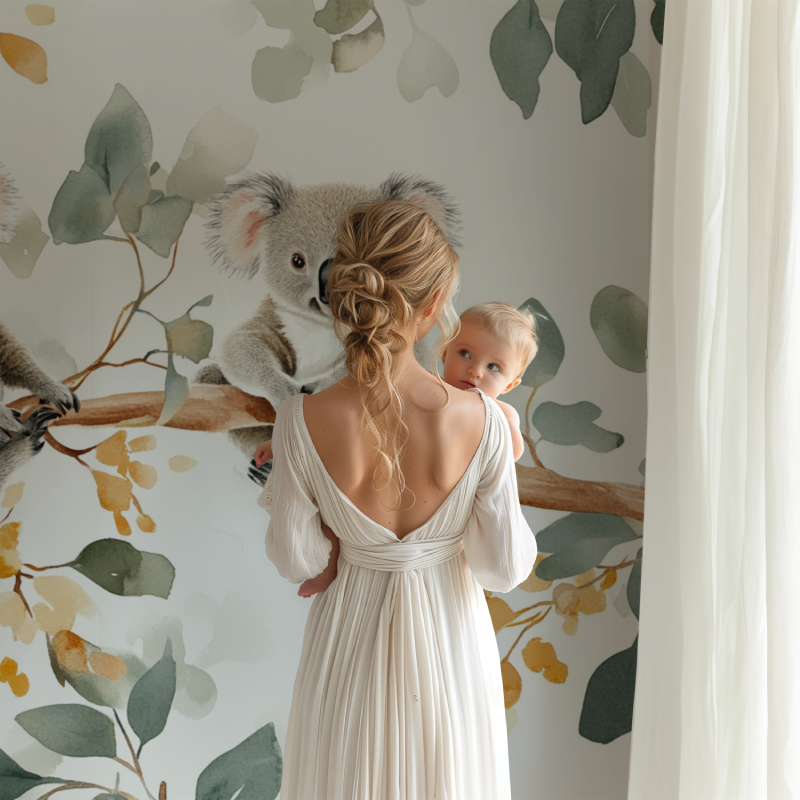 Ce papier peint est idéal pour une chambre d'enfant, apportant une touche de nature et d'émerveillement. Les koalas, symboles de quiétude et de paix, en font un choix particulièrement pertinent pour ceux qui cherchent à créer un espace de repos harmonieux.